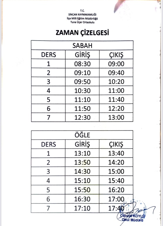 2025-2026 Eğitim-Öğretim yılı Ders Zaman Çizelgesidir.